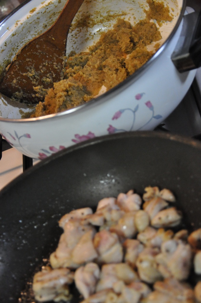 次にそれをきつね色になるまで根気よく炒めてチキン投入〜σ(^_^;)